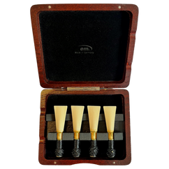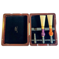 In StockThis oboe reed case is made of wood which has been stained to a brown padauk color. It holds 3 oboe reeds in a secure ribbon type holder. The inter...